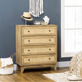 Cómoda de estilo natural con cuatro cajones frontales. - Diseño con detalles de ratán en los frentes de los cajones. - Acabado en madera con tiradores negros. Ref: 831-602v01nd