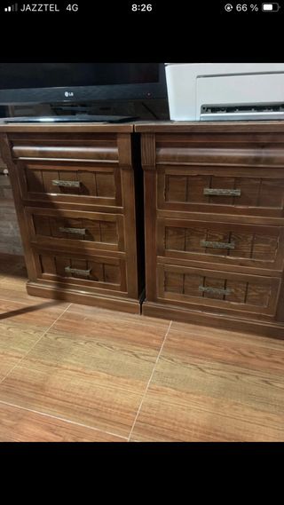 Conjunto de muebles de madera, ideal para tu dormitorio. Incluye cuatro mesitas de noche y dos cómodas. - Diseño robusto y elegante. - Acabado en tono marrón oscuro. -Una de las comodas presenta en una de suspatas claramente algo dañada cualquier pregunta hacedla sin problema.
