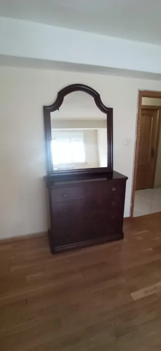 Conjunto de muebles de madera maciza (pino y cerezo) para dormitorio: - Cama individual de 90 cm con cabecero y piecero (el colchón se vende a parte por 250 euros, negociables si lo compras todo). - Mesilla de noche con tres cajones. - Cómoda amplia con cuatro cajones. - Espejo con marco de madera.