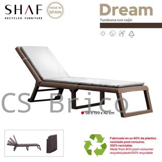 Tumbona Dream con Cojín Wengué Abrir galería de fotos del producto para ver fotos reales La tumbona Dream con cojín, tiene un diseño cómodo con un respaldo de 4 posiciones ajustable, y un cojín suave para disfrutar de momentos de relajación en exteriores. Sus 2 ruedas permiten transportarla sin esfuerzo, y es ideal para ahorrar espacio y guardarla en cualquier lugar porque se puede plegar fácilmente. Fabricada en España con material de plástico reciclado resistente a los rayos UV y las condiciones climáticas adversas. *Disponible en color antracita y wengué. La tumbona Dream tiene un cómodo y duradero diseño que cuenta con un res...
