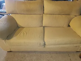 Sofá de dos plazas con un diseño clásico y cómodo. Su tapizado en tela le da un toque acogedor. - Tapizado en tela. - Color beige tirando a un amarillo neutro.en la última foto se ve el color - Respaldo reclinable Tiene un pequeño desperfecto en la tabla que sale de debajo del sofá(se puede arreglar fácilmente) Mide 2 metros totales y 1'40 de asiento
