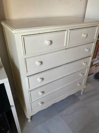 Cómoda de madera pintada en blanco. Requiere una capa de pintura para renovar su aspecto. - Diseño de seis cajones. - Tiradores metálicos.