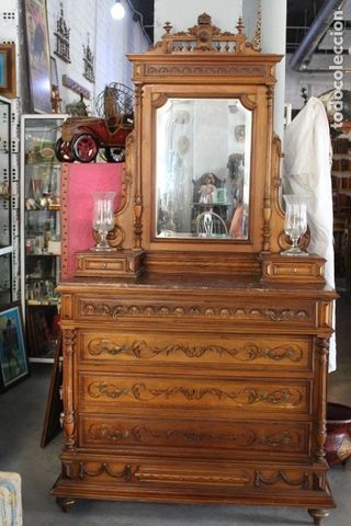 Cómoda con espejo realizada en roble, mitad del siglo XIX. Preciosas tallas y ornamentaciones. 4 cajones grandes y dos pequeños en la parte superior. tiradores de bronce espejo biselado cómoda y espejo en dos partes. medidas totales: 220 x 116 x 55 cm defectos a destacar: ver fotos tiene un pico de uno de los ornamentos superiores roto. tiene leves roces de estar en exposición el mármol, aunque apenas se ve, esta quebrado. pero sin faltas La comoda ha sido completamente restaurada, libre de carcoma. entrega Sevilla gratis.