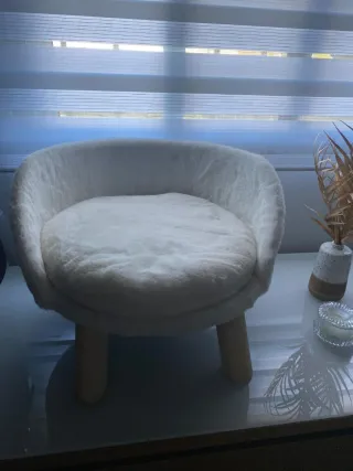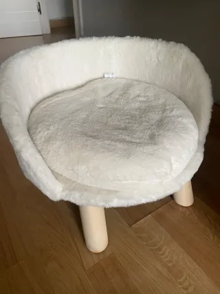 Cama para perros con un diseño moderno y acogedor. - Exterior de pelo sintético blanco. - Patas de madera claras. No usado ya que por talla es pequeño para mi perro