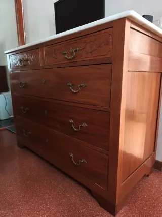 Cómoda de madera maciza de los años 40, con superficie de mármol. - Diseño clásico con detalles tallados. - Tiradores metálicos ornamentados. - Múltiples cajones para almacenamiento.