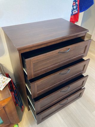 Cómoda de cuatro cajones con un diseño elegante y funcional. - Acabado en madera oscura. - Tiradores metálicos. - Amplio espacio de almacenamiento.