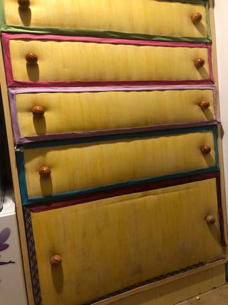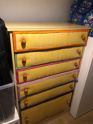 Cómoda con varios cajones y un diseño colorido. 5 cajones normales y 1 cajon muy grande abajo - Cajones con tiradores de madera. - Ribetes de colores vivos en cada cajón.