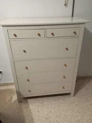 Cómoda de seis cajones con un diseño moderno y funcional. - Amplio espacio de almacenamiento. - Acabado liso y fácil de limpiar. Solo un pequeño desperfecto se adjunta el la foto.