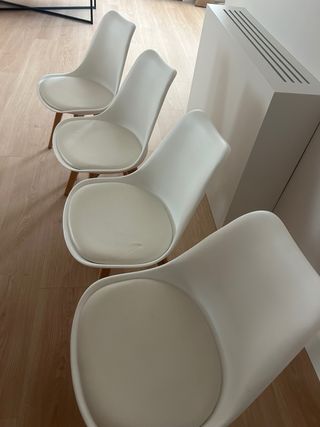 Conjunto de cuatro sillas con un diseño moderno y asiento acolchado para mayor comodidad. - Asiento con cojín integrado. - Patas de madera para un toque natural. - Estructura de plástico resistente.