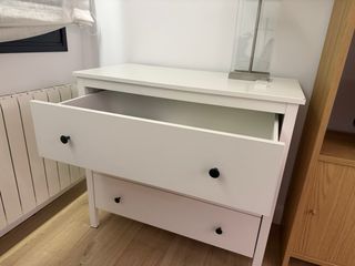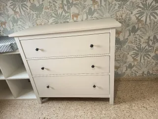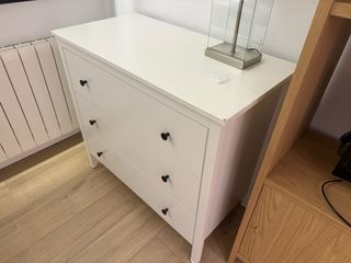 Cómoda de tres cajones de la serie Hemnes de Ikea. Su diseño clásico y funcional se adapta a cualquier habitación. - Tres cajones amplios para almacenamiento. - Tiradores negros. - Acabado en blanco. - Tiene algún desperfecto que se muestra en las fotos. - Precio original 199€ - Medidas en las fotos