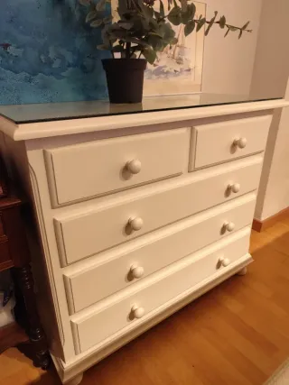 Elegante cómoda de estilo vintage con cinco cajones. - Tiradores metálicos decorativos. - Diseño clásico y atemporal. - Una cómoda 75 euros , las dos 100 euros.