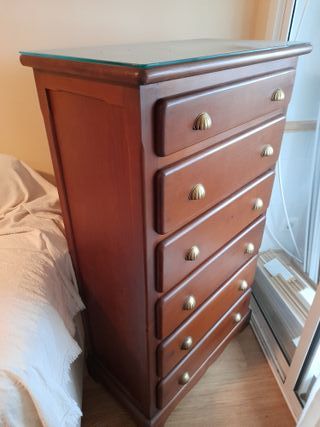 Cómoda vintage de madera maciza con cristal y tiradores de latón Elegante cómoda de siete cajones con cerradura, fabricada en madera maciza con acabado pulido y tapa de cristal. Tiradores de latón ornamentado y diseño clásico europeo. Pieza funcional y decorativa ideal para ambientes refinados.