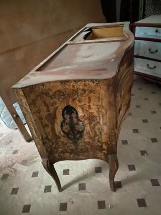 Mueble de madera con un diseño clásico, ideal para proyectos de restauración. - Patas curvas elegantes. - Diseño curvo en los cajones. - Superficie superior con detalles de desgaste. Medidas 120x 80 cm