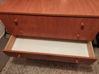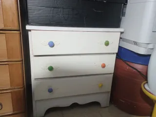 Cómoda de gran calidad, fabricada en madera con recubrimiento de melamina, muy robusta y estable. Prácticamente como nueva, sin golpes, hinchazones ni desperfectos. Dispone de 5 cajones amplios, que deslizan correctamente, ideales para almacenaje de ropa, textiles o documentos. Tiradores metálicos en acabado dorado que dan un toque clásico, aunque la pintura está algo desgastada por el paso del tiempo. Mueble duradero y muy superior en calidad a muchas cómodas actuales. Medidas: Alto: 82 cm Fondo: 46 cm Largo: 111 cm Precio negociable. #cómoda #mueble #aparador #mueblesegundamano #maderamaciza #mueblecalidad