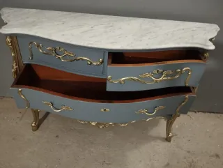 Elegante cómoda de estilo Luis XV con tapa de mármol y detalles dorados. - Diseño curvo y ornamentado. - Patas cabriolé. - Tiradores y cerraduras doradas.