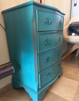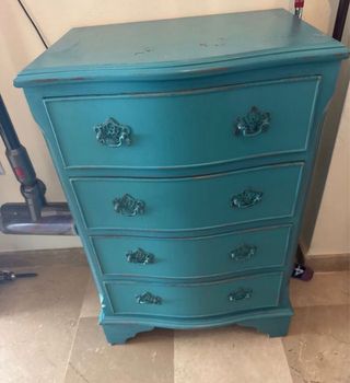 Elegante cómoda de estilo vintage con un acabado en color azul turquesa. - Diseño curvo y detalles ornamentales. - Tiradores metálicos. - Cuatro cajones amplios.