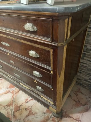 Mueble cómoda de estilo antiguo con detalles en madera y una cubierta de mármol. - Cajones con tiradores metálicos. - Diseño clásico y elegante.