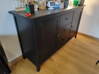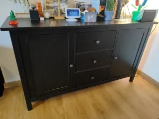 Cómoda de la serie Hemnes de IKEA en acabado negro. Cuenta con un diseño clásico y funcional. - Tres cajones centrales. - Dos puertas laterales con espacio de almacenamiento.