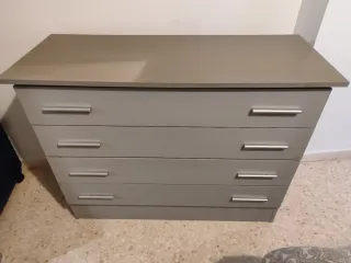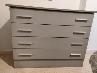 Cómoda de cuatro cajones pintada en color gris. Los rieles están algo desgastados, especialmente en el tercer cajón (se pueden cambiar). Está tal y como se ve en la foto. Sólo se acepta recogida.