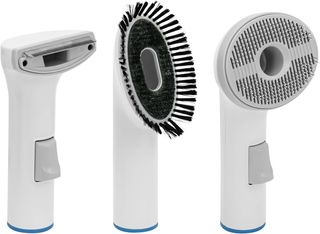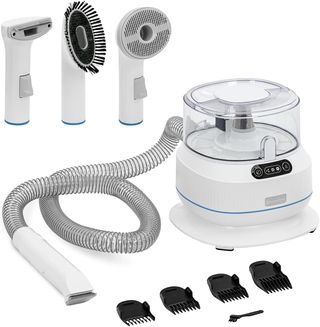Cortapelos para perros con sistema de aspiración integrado. El depósito tiene una capacidad de 1.4 litros. - Incluye varios cabezales para diferentes longitudes de corte. - Manguera flexible para mayor comodidad. - Base del aspirador con controles. - Accesorios de cepillo y limpieza.