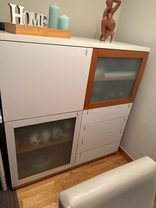 Estantería/cómoda en buenas condiciones. - Diseño moderno y funcional. - Acabado liso y fácil de limpiar. Actualmente tiene 4 niveles pero tiene 2 tablas mas, así que se podría adaptar a 6 niveles. La cómoda/estantería esta en buenas condiciones, no es nueva pero a simple vista no se le ve ningún desperfecto (mancha, raya, pegatina, etc.) Las medidas son: 39,5cm de profundidad 60cm de ancho 129cm de largo