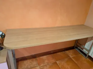 Escritorio con un diseño moderno y funcional. - Superficie de madera clara. - Patas y estructura de metal. - Bordes redondeados para mayor comodidad.