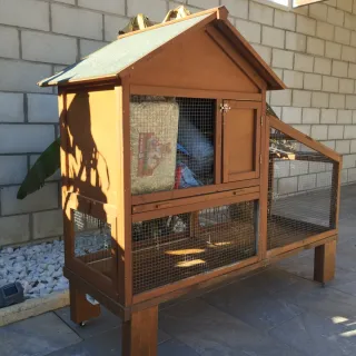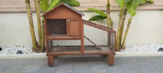 Jaula para conejos con tres compartimentos que se pueden unir. Piso inferior con ranura central y canaleta inferior para que no acumulen suciedad y ruedas para mover con facilidad. Accesorios incluidos comedero, bebedero, comedero heno... - Estructura de madera. - Múltiples áreas de acceso y ventilación. - Base amplia para mayor comodidad.