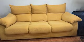 Se venden dos sofás de tela en color amarillo. Se pueden comprar juntos o por separado. - Diseño moderno y cómodo. - Tapicería suave al tacto. - Sofá 3 plazas: 2,20m de largo y 95cm de ancho - Sofá 2 plazas: 1,65m de largo y 95cm de ancho