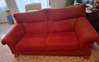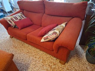 Sofá de 3 plazas con un bonito color teja. Muy cómodo y elegante. Tapicería de tela en muy buen estado. Desenfundable (con cremallera). Patas de madera (el robot aspirador pasa por debajo del sofá). 2 metros de ancho por 1 metro de alto. No hay animales en la casa. Cabe en el ascensor. Se recoge en Torrent. Un saludo. Sofa tela, sofá 3 plazas, sillón, muebles.