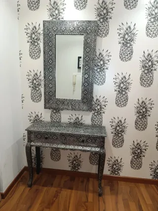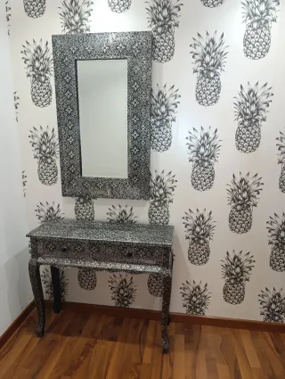 Elegante recibidor con un diseño único y detallado. - Acabado en tonos plata y negro. - Patas curvas con un toque clásico. - Cajones con tiradores a juego. MEDIDAS: Espejo : 60× 1metro Cómoda: 90 ancho 30 profundo 75 alto