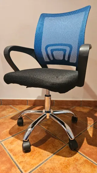 Silla de oficina con un diseño moderno y cómodo. Usada 6 meses porque la empresa me envió otra para teletrabajar. - Respaldo de malla transpirable en color azul. - Asiento acolchado en tela negra. - Base metálica con ruedas para fácil movilidad.