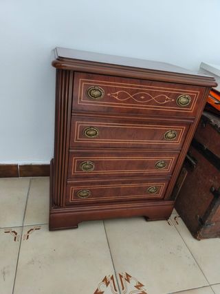 Preciosa cómoda de madera, ideal para dormitorio. Se encuentra en buen estado. - Cuatro cajones con tiradores de metal. - Diseño clásico y elegante. - Madera de color marrón oscuro.