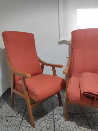 Conjunto de dos sillones con un diseño cómodo y materiales de calidad. - Tapicería en tela color teja - Estructura de madera. - Brazos curvos de madera.