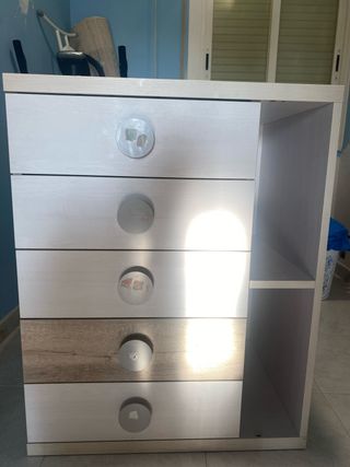 Mueble de cajones con un diseño infantil y divertido. - Tiradores en forma de triángulo rojo. - Un cajón con un simpático diseño de búho. - Acabado en madera clara y detalles en beige.Super bonito.cajones amplios., en muy buen estado ..y comodos de abrir.Caben muchas cosas,profundidad.te decora en cualquier Rincon de tu hogar,como habitacion!! Solo venta en persona. Aprovecha oferta!🎊💫🎉✨️🎁