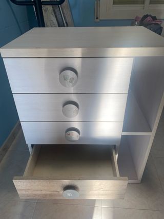 Cajonera con un diseño moderno y funcional. - Combinación de colores blanco y madera. - Tiradores redondos. - Compartimento abierto lateral.