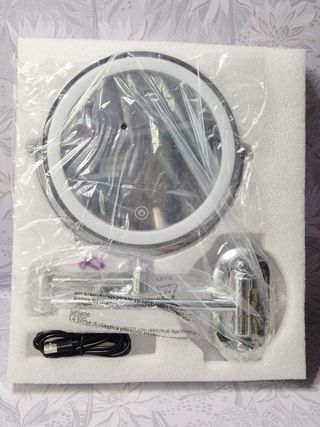Espejo de maquillaje de pared con brazo extensible y aro de luz LED regulable. Perfecto para baño o tocador. ✔ 3 tipos de luz (cálida, neutra y blanca) ✔ Regulación de intensidad ✔ Espejo con aumento 3X ✔ Carga por USB ✔ Brazo extensible plegable ✔ Instalación en pared con tornillos (incluidos) Ideal para maquillaje, cuidado facial o afeitado. Muy cómodo porque se acerca y se aparta fácilmente de la pared. Estado: nuevo, sin uso. Medidas aproximadas: • Diámetro total: 21 cm • Espejo: 16 cm • Base de pared: 12 cm Se entrega con cable USB, tornillos e instrucciones.
