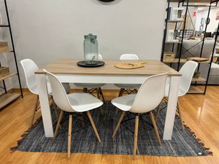 Conjunto de mesa de comedor con seis sillas. - Mesa con sobre de madera y patas blancas. - Sillas de diseño en color blanco. 📦 Productos totalmente nuevos, entregados en su caja original de fábrica 🚚 Envíos a domicilio con nuestro propio servicio de reparto ✅ Calidad garantizada 💳 Pago contra reembolso (paga cómodamente al recibir su pedido) 📲 Atención directa por WhatsApp: 697*569*052*