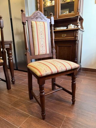 Conjunto de seis sillas de estilo clásico, perfectas para dar un toque elegante a tu comedor. 6 unidades. - Estructura de madera robusta. - Tapicería con diseño floral y rayas en tonos cálidos. - Respaldo y asiento cómodos. Precio de las 6 unidades. Para recoger. Medidas Silla: 110 x 49x 44