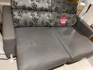 Sofá de dos plazas con un diseño moderno y cómodo. Su tapicería de tela le da un toque acogedor. Asientos extraíbles y cabecera/respaldo regulable. Tiene defectos en la tela en el asiento y en las esquinas, nada que no pueda solucionar una funda.
