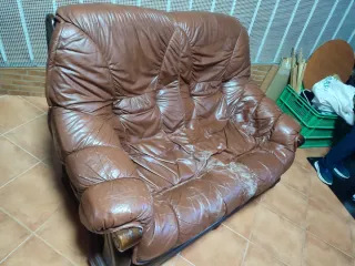 Se venden dos sofás de piel en color marrón. Son cómodos y amplios, tienen marcas de uso pero ningún daño estructural importante. 90€ por el de 3 plazas 60€ por el de 2 plazas - Sofás fuertes y duraderos. - Tapicería de piel. - Diseño clásico y elegante.