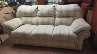 Cómodo sofá de tres plazas con un diseño clásico y elegante. De muy buena calidad, fabricado en yecla, posibilidad de llevar se a juego el sillón, las dos piezas por 150€ - Tapicería de tela con rayas verticales. - Tonos beige y multicolor que combinan fácilmente. - Estructura robusta y asientos confortables.