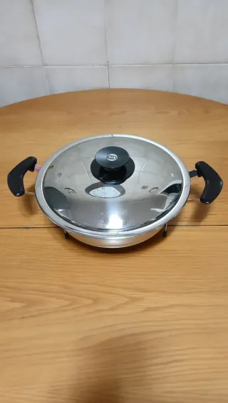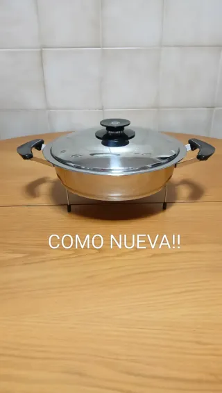 Cazuela AMC de 24 cm de diámetro( sin contar los bordes) por 6 cm de altura. Es nueva, sin usar pero de haber estado tiempo guardada tiene algún ligero roze. - De acero inoxidable 18/10 el mejor y más grueso - Asas ergonómicas para un agarre cómodo y pomo , de BAQUELITA, suaves y frías. - Válida para todos los fuegos menos la inducción. Tengo muchas cosas de AMC Visita mi perfil y crea tu propio lote con la opción de wallapop Es súper fácil y ahorras en gastos de envío