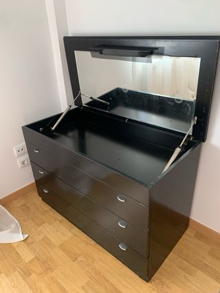 Cómoda de tres cajones años 70 con tocador (luz y espejo). La tapa se sube con dos hidraulicos (uno de ellos esta deseganchado) - Medidas 110x53x68 - Acabado brillante. - Tiradores plateados.