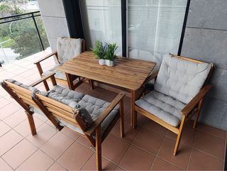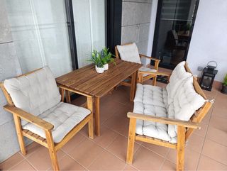 Conjunto de muebles para exterior compuesto por: Mesa extensible, la medida cerrada queda en 140x76cm. Cada ala son 60cm más. En total queda en 260cm. La mesa funciona correctamente pero le falta barniz. Tambien hay dos sillas reclinables de teca tambien de Ikea. Se pintaron a posteriori. La azul tiene una lama rota que se puede arreglar con una pletina. A ambas les hace falta barnizar. Finalmente hay un banco de teca pintado de amarillo. Le falta barnizar y tiene una lama rota que también se puede arreglar. Los cojines tienen un año y estan incluidos en el precio. Cada pieza del conjunto sale por 10€, cojines incluidos.