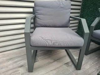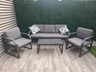 Conjunto de mobiliario para exterior, ideal para tu terraza o jardín. Incluye un sofá de tres plazas, dos sillones individuales y una mesa de centro. - Estructura de aluminio. - Cojines de tela para el exterior Medidas; Mesa 90×45 Sillon de 3 plazas 175×65×73 de altura Sillon de una plaza 65×65