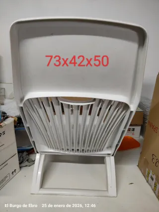 Conjunto de ocho sillas de plástico blancas, perfectas para tu espacio exterior. Diseño apilable para un fácil almacenamiento. No se hacen envíos. Entrega en mano en Cuarte de Huerva