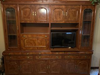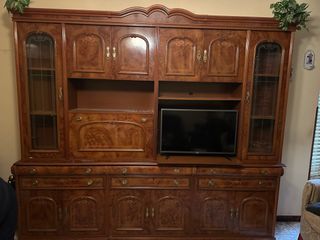 Mueble de salón de madera de estilo clásico, perfecto para organizar tu espacio. - Acabado en madera de roble. - Amplios compartimentos y cajones. - Incluye vitrinas y espacio para TV.