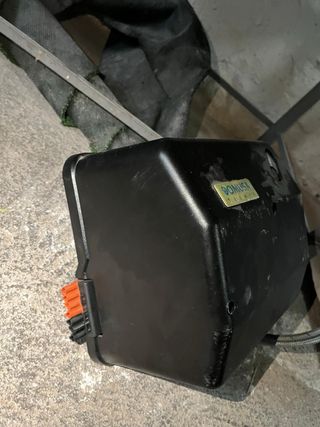 Quemador para caldera de gasoil. - Componente metálico plateado. - Conector de entrada de color naranja y negro.