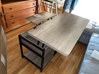 Mesa de centro con superficie elevable y extensible. Su diseño moderno se adapta a diferentes espacios. - Tablero con acabado imitación madera. - Estructura metálica. - Superficie elevable y extensible. Poco uso. Muy cómoda para espacios pequeños