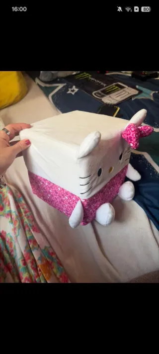 Este cojín de Hello Kitty es un accesorio adorable y suave. - Diseño con estampado de corazones. - Orejas y lazo característicos de Hello Kitty. - Patas y brazos de peluche.
